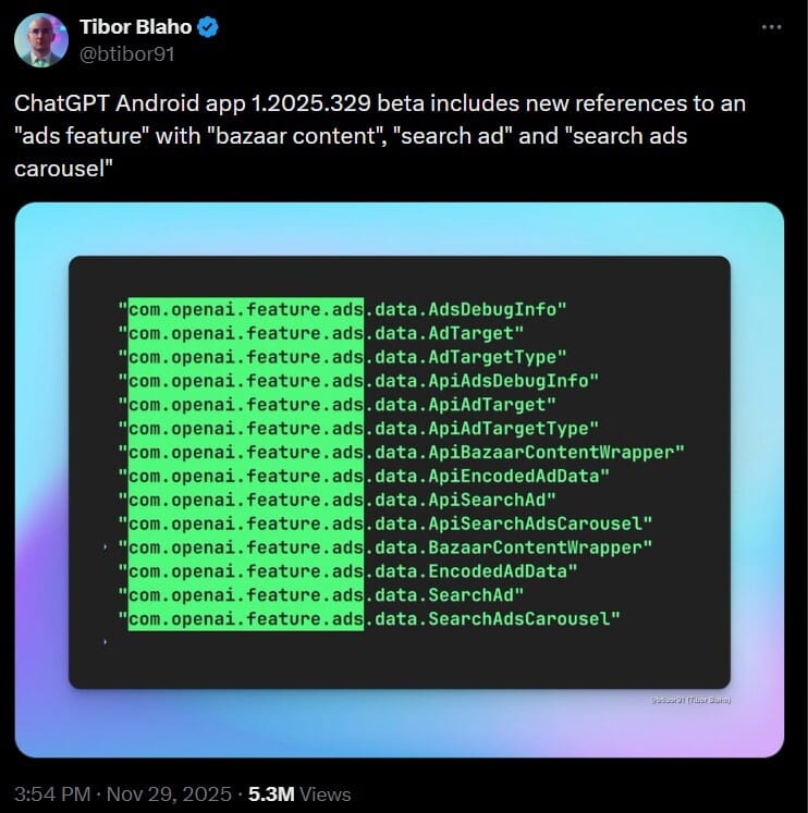 Strings uncovered in the latest ChatGPT Android beta reveal references to an “ads feature,” including “search ads carousel,” “bazaar content” and other elements that sound a lot like the blueprint of a full advertising stack.